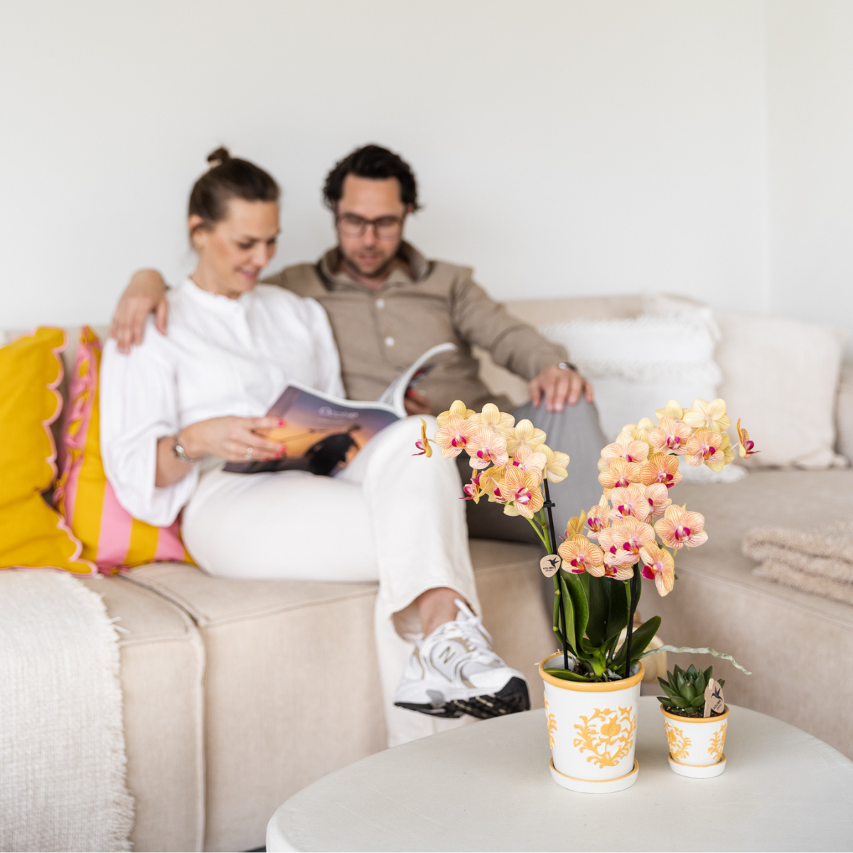 Orchidée jaune Lima + Malaga en pot décoratif orange clair - taille du pot Ø9cm