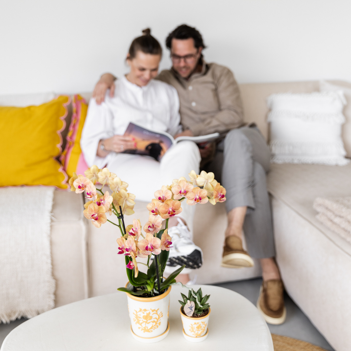 Quelle gaieté et quelle harmonie avec cette orchidée colibri jaune « Lima » mise en valeur dans le pot décoratif Malaga orange clair ! Une association parfaite qui apportera instantanément une touche estivale à votre intérieur ! L'orchidée colibri Lima est un spectacle enchanteur avec sa taille compacte et ses fleurs éclatantes. Ses branches sont un peu plus courtes, ce qui la rend d'autant plus charmante. Les fleurs rayonnent d'un jaune chaud avec de belles taches rouges et une élégante lèvre violette.