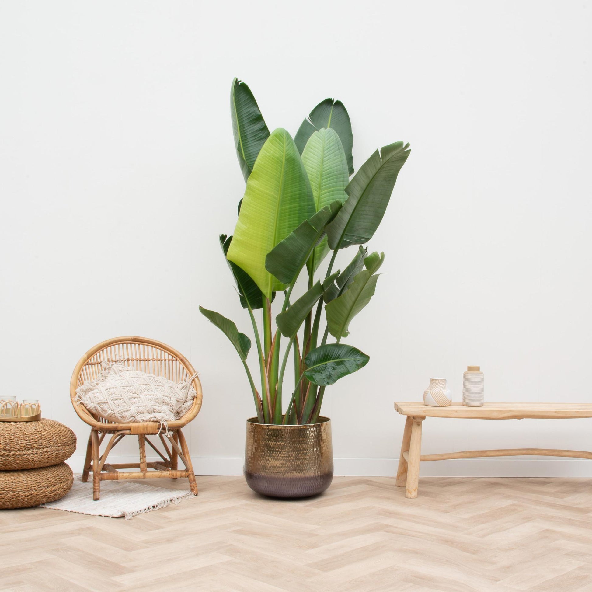Strelitzia Augusta met meerdere stammen, ook wel bekend als de witte paradijsvogelbloem, voegt een vleugje tropische pracht toe aan binnen- en buitenruimtes. Met zijn opvallende, witte en blauwachtige bloemen die lijken op paradijsvogels en een elegante, meerstammige structuur, creëert Strelitzia Augusta direct een gevoel van weelderige allure en botanische elegantie. Deze plant gedijt goed in zonnige en goed doorlatende bodems, waardoor hij perfect is voor diverse tuinen en landschapsontwerpen. Naast zijn esthetische aantrekkingskracht fungeert Strelitzia Augusta met meerdere stammen ook als een opvallend decoratief element, waardoor een spectaculaire en weelderige weergave ontstaat. Met zijn weelderige bloemen en opvallende structuur is Strelitzia Augusta met meerdere stammen een favoriet onder liefhebbers van weelderige en opvallende planten.